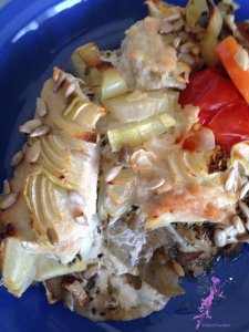A következő réteg egy adag darált pulykahusi volt, ezt is sóztam, borsoztam, és egy fej apróra vágott hagymát, pár szem koktélparadicsomot szórtam még rá, kis hántolt szotyit még a végén a ropogósság miatt, aztán mehetett is a sütőbe 200 fokra, úgy 45 percre.