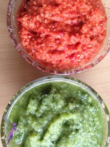 Zöld: egy salátacukkinit egy pár levél medvehagymával és egy-két gerezd fokhagymával, sóval összeturmixoltam.
