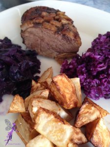 A hagyományos párolt lilakáposztával kezdtem, kis fej vöröshagymát felvágtam és kis kacsazsíron megfuttattam. Rádobtam a felvágott lilakáposztát, sót, kis vizet, majd fedő alatt pároltam. Ráfigyelős a dolog, ha elfőtte a levét nem árt pótolni. A végén egy evőkanál málnaecetet és egy kis cukorhelyettesítőt tettem bele.