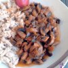 A köret most éppen gomba és édesburgonya volt. A gomba seperc megvolt, mert cuki kis aprószemű gombát kaptam, szóval csak meghámoztam, megmostam, sóztam, fokhagymát tettem bele, és kis vízzel feltettem párolódni. Mire végeztem a csirkével, ez is kész volt. Menet közben pedig két szem édesburgonyát karikákra vágtam és kókuszzsíron kisütöttem.
