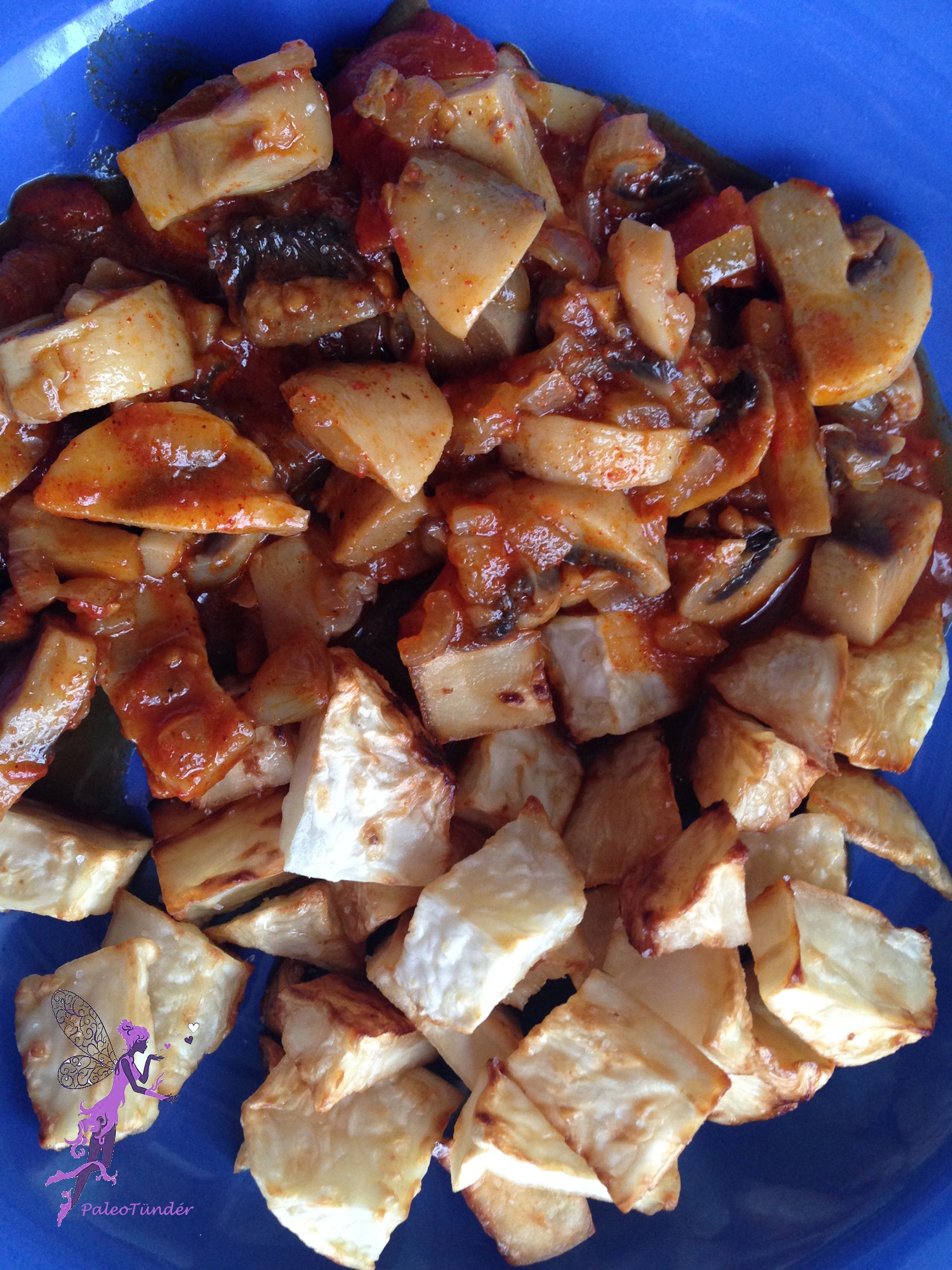 Amíg sült, kókuszzsírt hevítettem, és mintha csak sült krumplit csinálnék, kisütöttem a zellerkockákat. A sárgarépákat megtisztítottam, lereszeltem, és fedő alatt kábé 10 perc alatt kis folyadékkal (víz vagy kókusztej) megpuhítottam. Sóztam, curry port szórtam bele és egy kis kókusztejszínt (Cocomas) is öntöttem hozzá. (Egyébként ez utóbbi elhagyható, dob rajta ízben, az biztos, de egyáltalán nem alapfeltétel.)